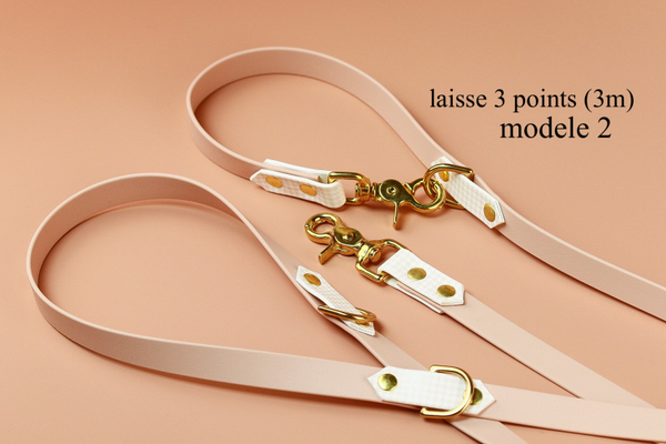 Pour la laisse vous aurez le choix entre une laisse simple ( modèle 1, 1m50 avec anneau à la poignée et petit rappel au mousqueton d'attache) ou une laisse 3 points (modèle 2, en 3m de longueur avec motif à la poignée et rappel de motif aux anneaux d'attache)