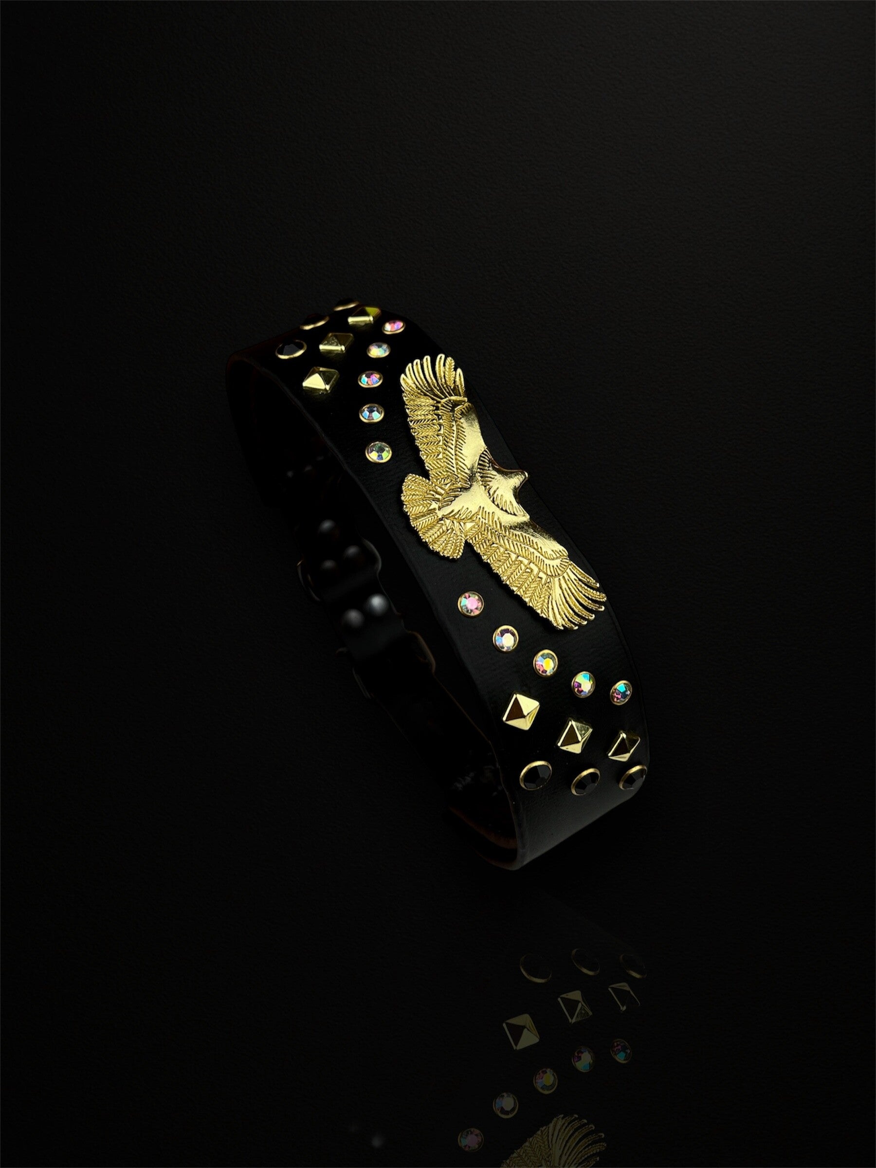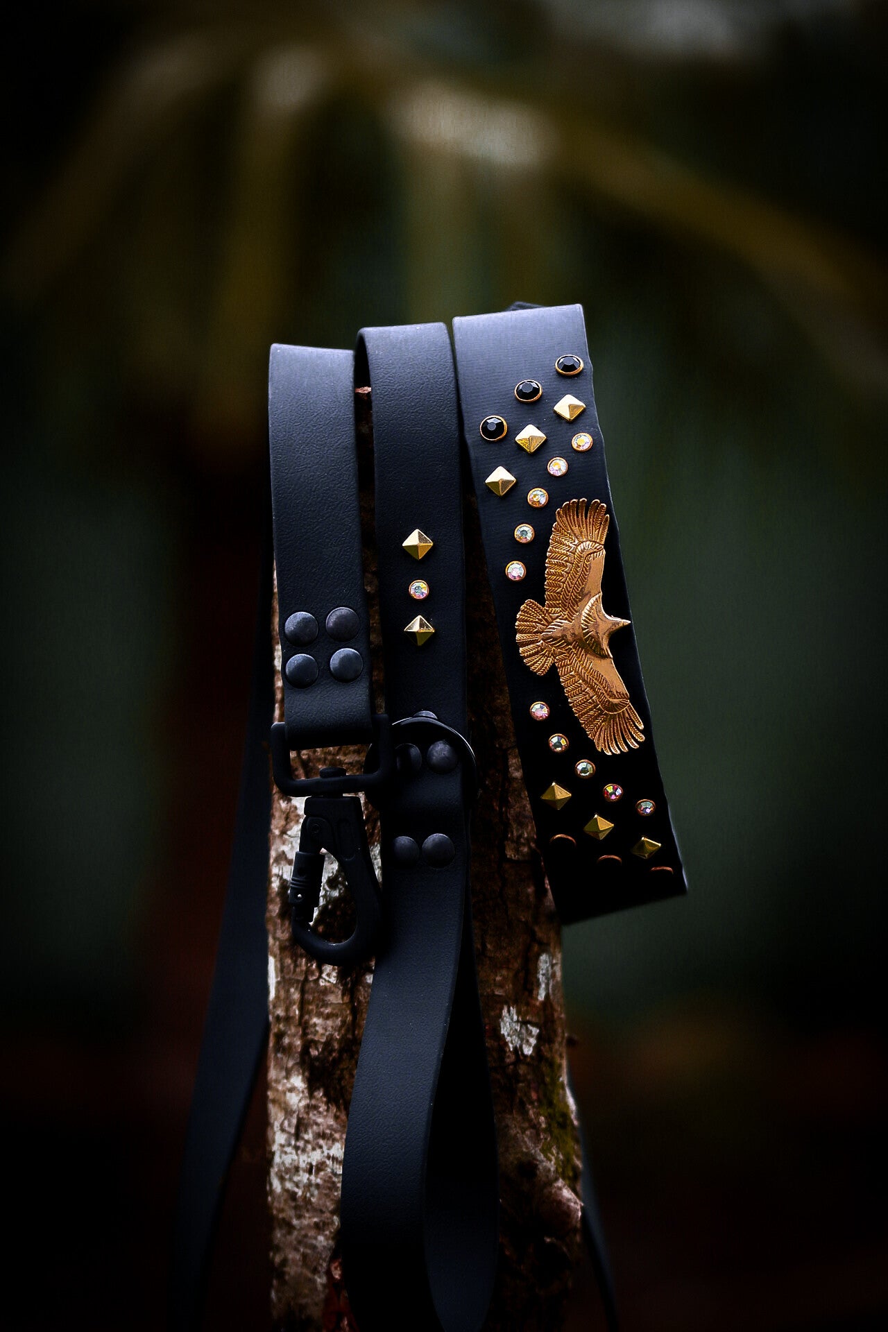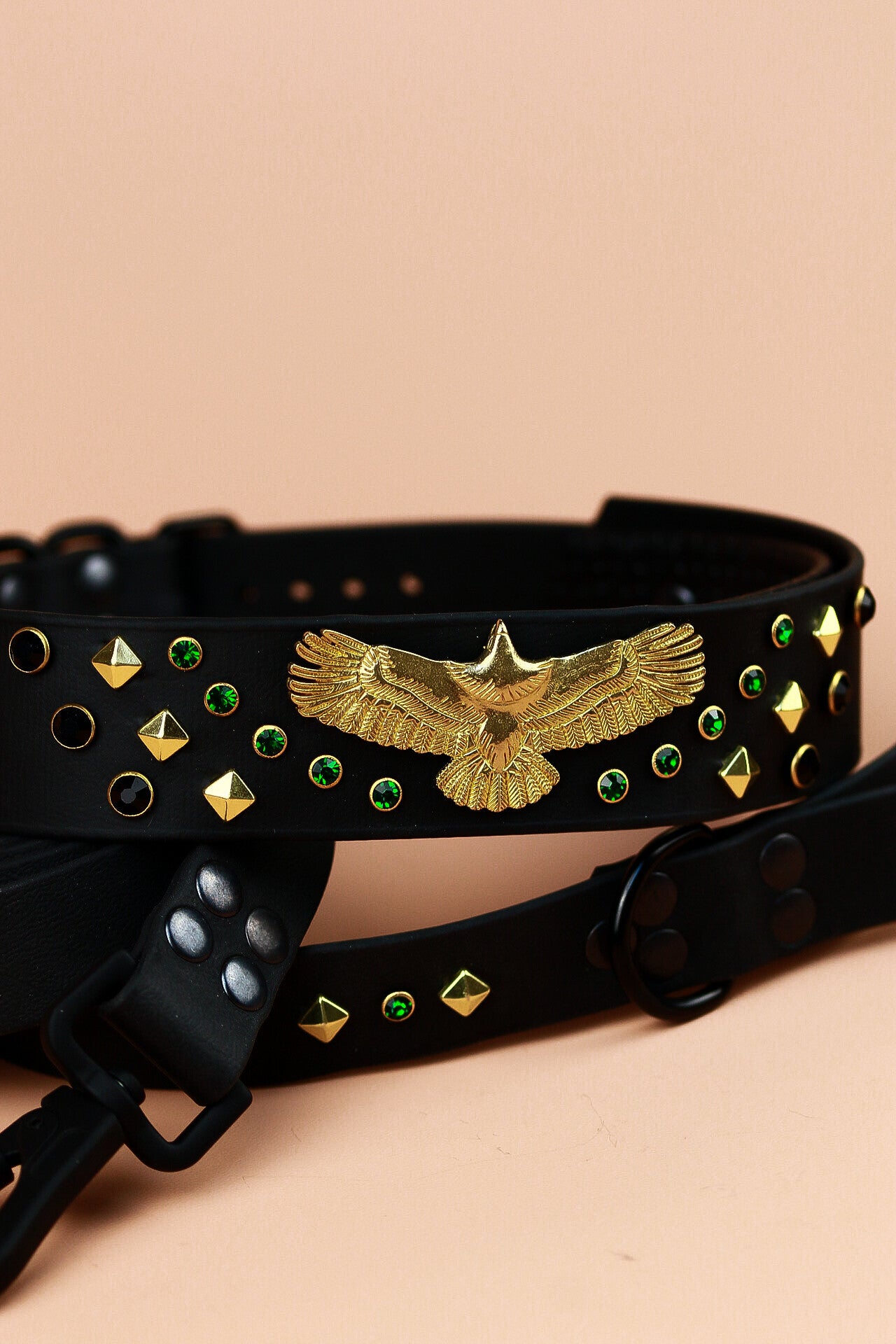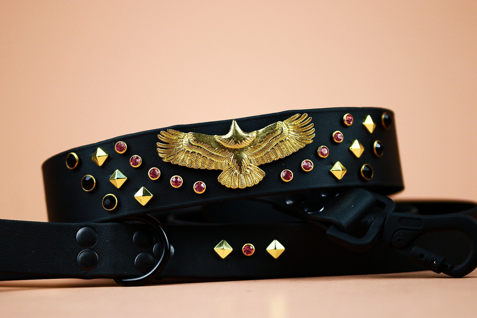 Offrez à votre compagnon un look royal avec cet ensemble collier + laisse en biothane, orné d’un majestueux aigle doré en relief et de strass multicolores sertis à la main. Chaque pièce est agrémentée de clous pyramides dorés pour une allure puissante et élégante.